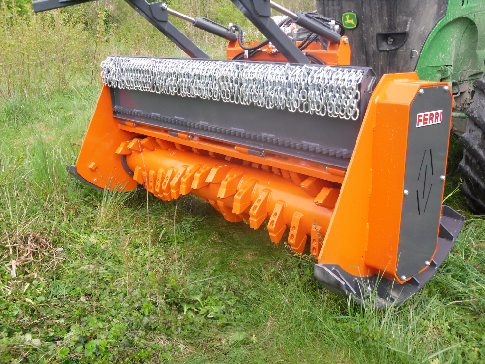 La gamma di potenti trinciatrici forestali TFC, è espressamente dedicata alla manutenzione del verde incolto e boscaglia, alla creazione e manutenzione di strade tagliafuoco, argini e ferrovie contaminati da arbusti, ecc. Le caratteristiche principali di queste macchine sono il telaio interamente in acciaio ad alto indice di snervamento, dal controtelaio interno rivestito in HARDOX 400 e dal rotore che con utensili fissi o APEIRON a denti fissi con riporti al tungsteno e rotore con profili in acciaio, assicura un diametro di taglio fino a 40 cm. L’irrobustimento delle fiancate aumenta la tenuta del corpo macchina evitando possibili incrinature dovute a strappi e pressioni. Altri particolari importanti sono: il martinetto idraulico per apertura cofano, i 2 controcoltelli con spessore da 20 mm, le slitte di appoggio di grossa sezione, la trasmissione a 10 cinghie, le protezioni anteriori con 2 file di catene, ecc.